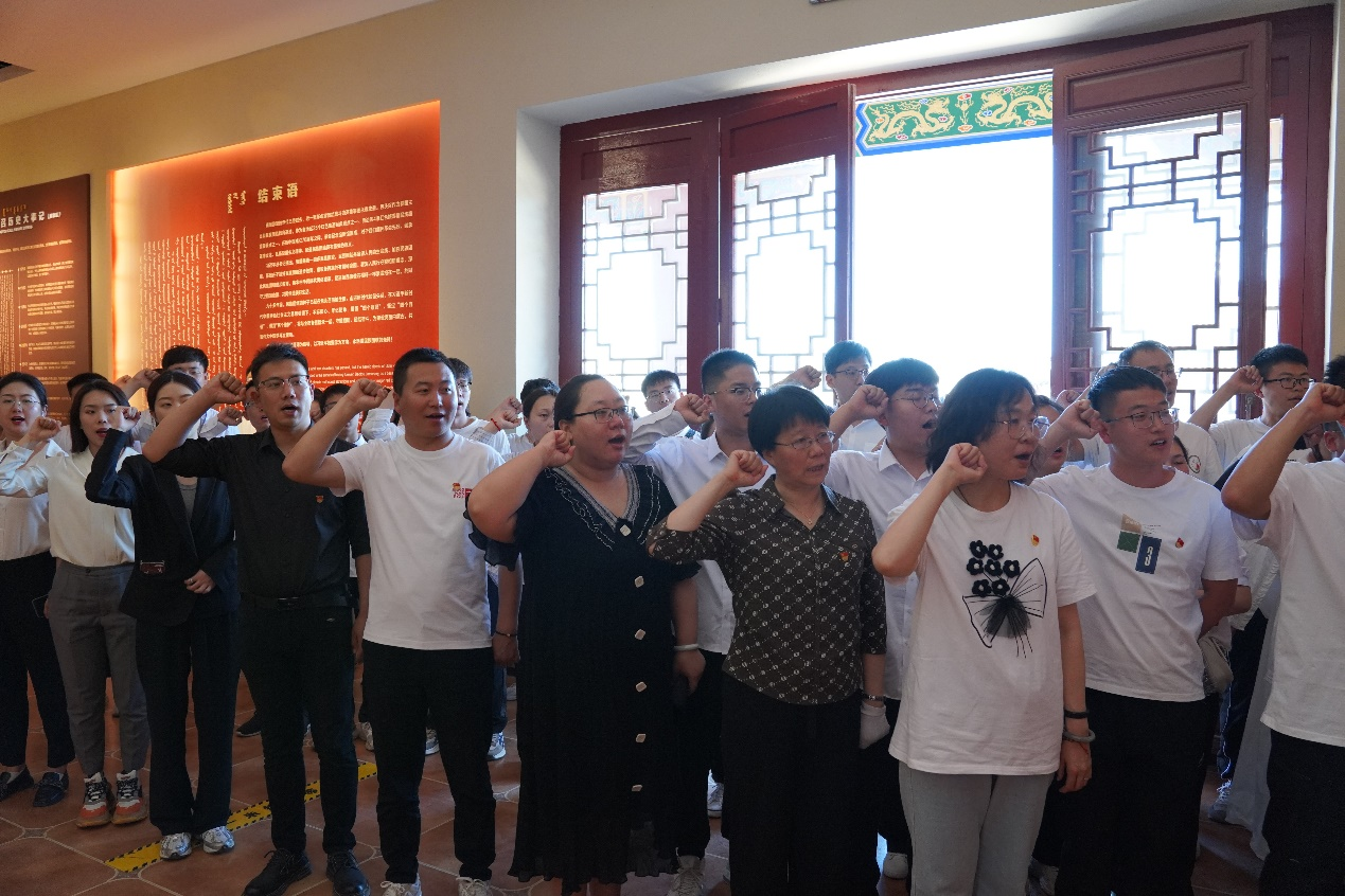 包头召革命纪念馆是包头早期开展革命活动的场所,是包头市爱国主义教育基地。纪念馆共有三个部分,分别是追踪历史、峥嵘岁月、时代春风。在讲解员的带领下,大家详细了解了纪念馆的由来,以及乌兰夫、刘仁、奎璧、吉雅泰、李森等一大批蒙汉及各民族革命者曾留下光辉足迹。纪念馆内,每一件饱含历史印记的书籍、照片、遗物都给大家留下了深刻的印象,带大家回顾了党的光辉历史和奋斗足迹。之后,全体党员举行了重温入党誓词仪式。