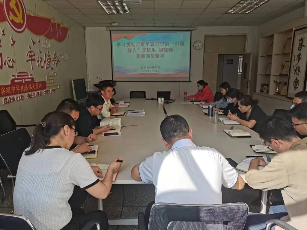 2022年8月13日,习近平总书记给“中国好人”安徽黄山风景区工作人员李培生、胡晓春回信引发热烈反响,按照中宣部、中央文明办印发《关于深入学习宣传贯彻习近平总书记给“中国好人”李培生 胡晓春重要回信精神的通知》要求,学院党委于9月28日在秋实楼B403会议室召开党委扩大会议,传达文件要求和学习习近平总书记重要回信精神。会议由学院党委书记张鑫主持,学院党委委员、各党支部书记、系室负责人参加学习会。
