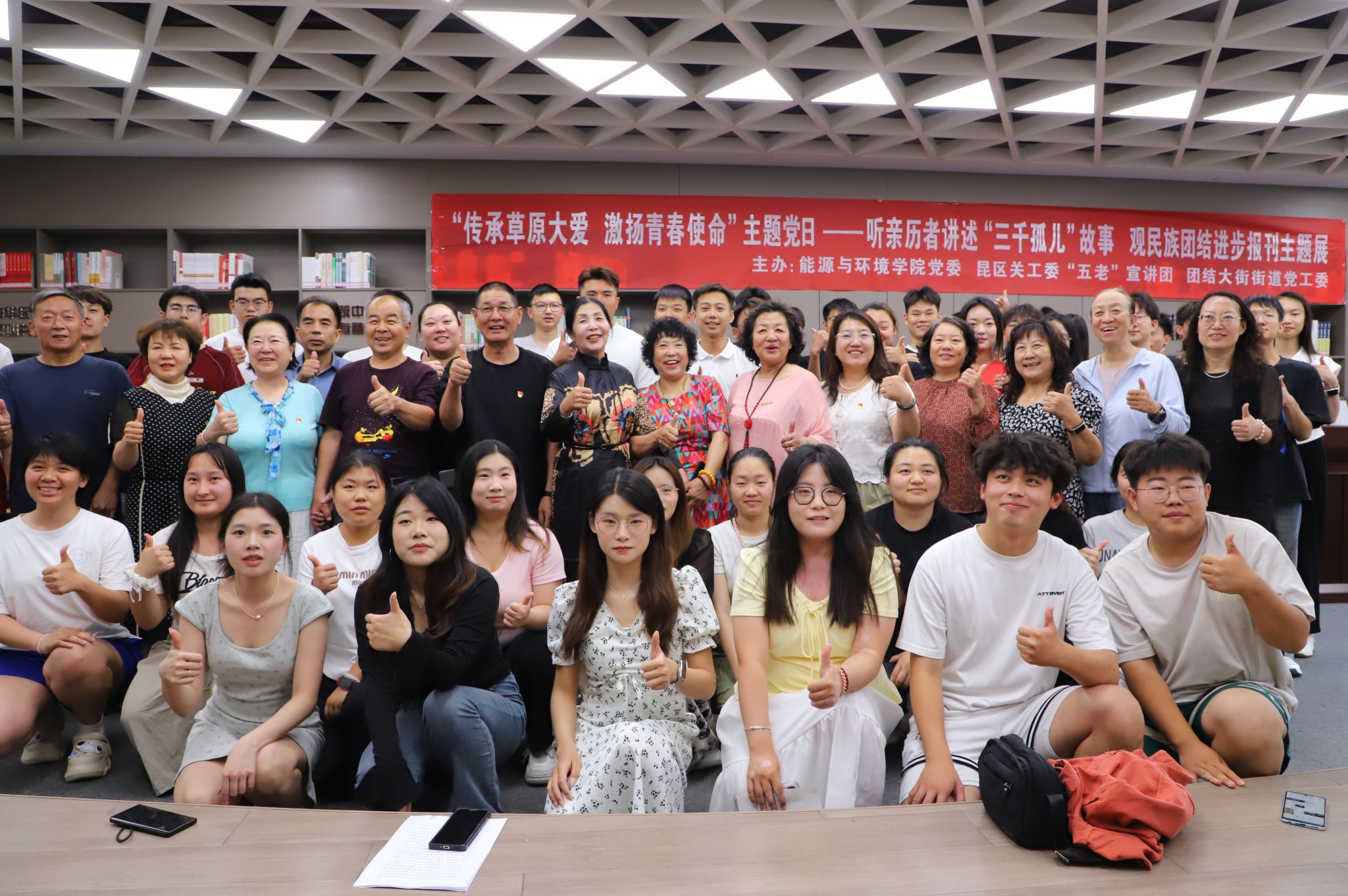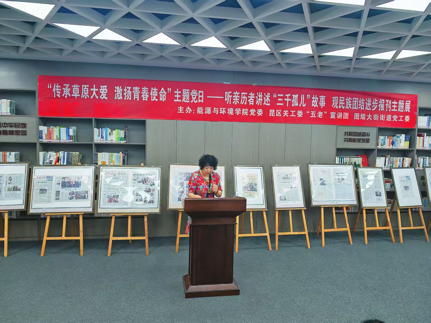 为深植家国情怀,传承民族团结精神,激发青年党员的历史责任感与时代使命感,2025年6月12日下午,学院党委与昆区关工委、团结大街街道党工委在图书馆石榴籽阅览室联合举办“传承草原大爱 激扬青春使命”主题党日活动。活动聚焦历史深处闪耀人性光辉的“三千孤儿入内蒙”故事,辅以珍贵的民族团结进步报刊主题展,特邀三位“国家的孩子”亲历者与见证者进行分享,为学院师生党员带来一堂生动而深刻的思政大课。