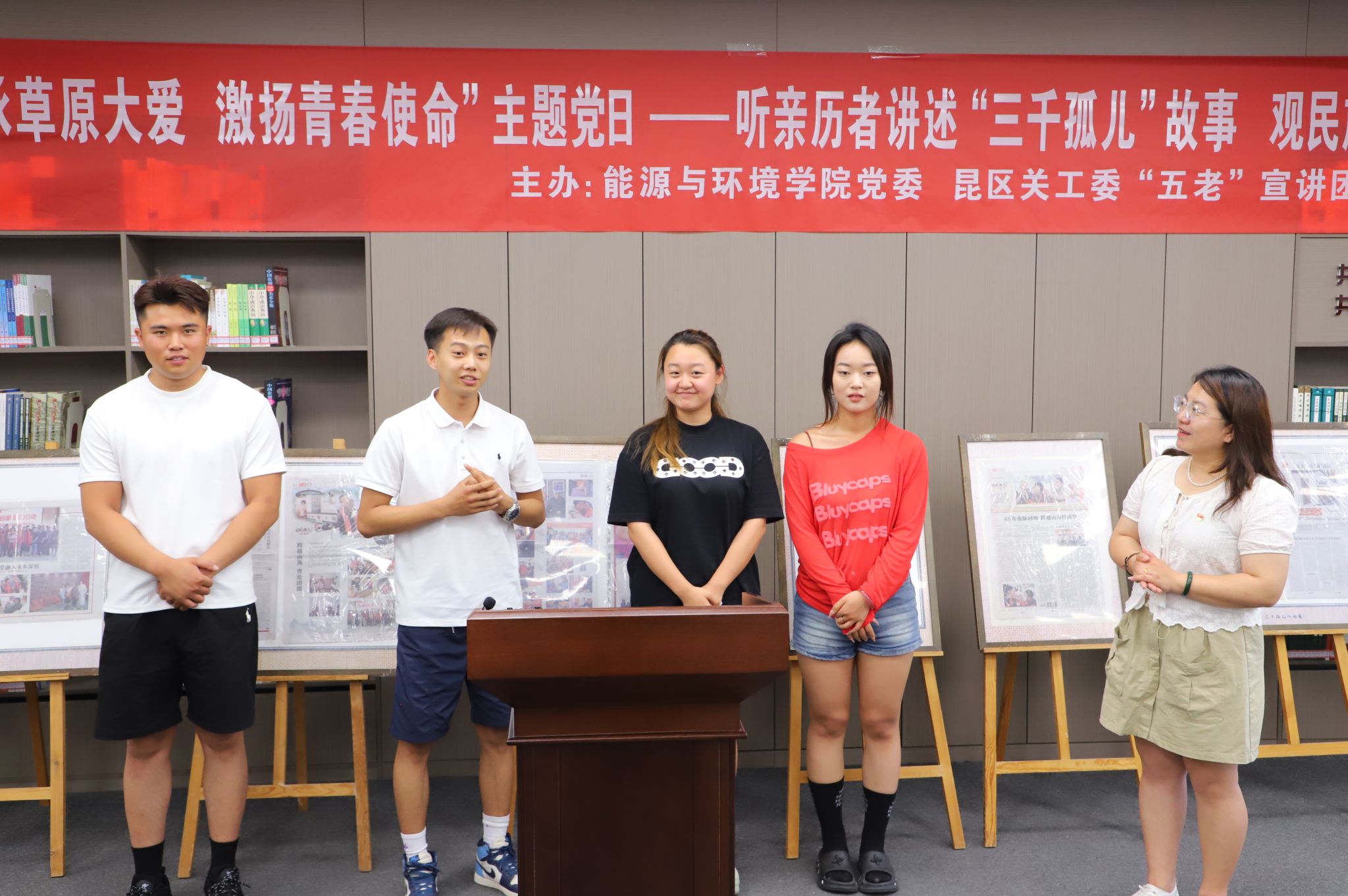 本次主题党日特邀请到20世纪60年代初那场跨越地域、超越血缘的生命接力的亲历者——“国家的孩子”代表赵俊华和吴丹老师。赵俊华作为亲历者代表,饱含深情地讲述了被包钢建设者家庭收养的成长故事,以及今年五月成功寻亲的感人历程。她回忆起养父母用羊奶将自己养大,教自己坚韧善良的过往,言语中满是对草原父母的感恩。这份跨越时空的经历,串联起“三千孤儿入内蒙”的温情与“齐心协力建包钢”的奋斗,生动诠释了民族团结内涵,让在场的大学生们深刻感受到守望相助的力量。