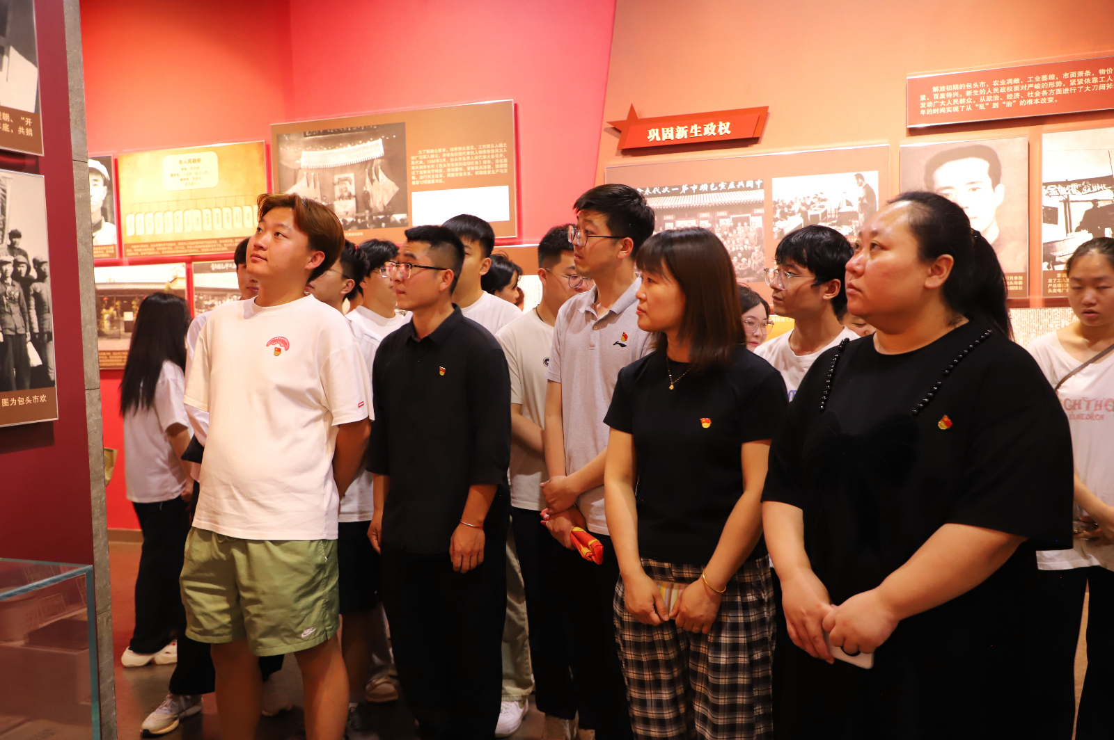 随后,师生党员步入党史教育展览厅,在讲解员的带领下,通过沉浸式的参观体验,共同回顾党的光辉历程,感受包头市的发展变迁。在庄严肃穆的展厅里,党员们驻足观看泛黄的历史照片与珍贵文献,深入了解了中国共产党的发展历程以及各个时期所取得的辉煌成就,领会了“蒙古马精神”“三北精神”“齐心协力建包钢”的深刻内涵,这些镌刻在历史长河中的红色印记,既是城市发展的见证,更是激励学生党员接续奋斗的力量源泉。
