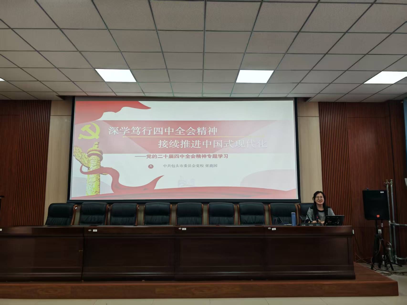 本次讲座特邀中共包头市委员会党校党史党建教研室教师张鹿园莅临授课,围绕党的二十届四中全会精神进行专题辅导。讲座紧密结合当前形势与任务,从“十五五”时期的历史方位、总体部署和重大任务三个方面进行了深入阐释和解读。