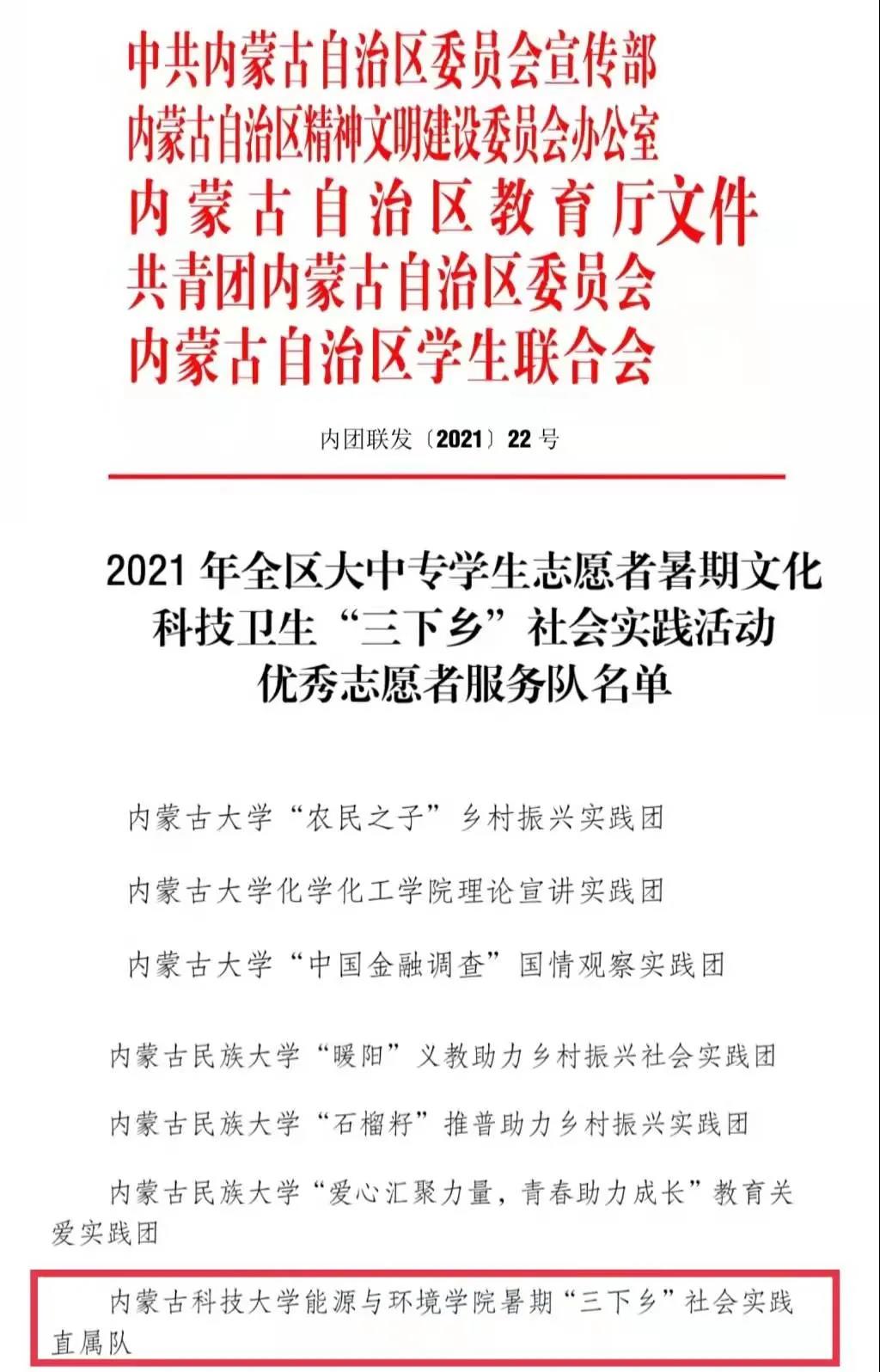 近日,中共内蒙古自治区委员会宣传部、内蒙古自治区精神文明建设委员会办公室、内蒙古自治区教育厅、 共青团内蒙古自治区委员会、内蒙古自治区学生联合会联合印发《关于表彰 2021年全区大中专学生志愿者暑期文化科技卫生“三下乡”社会实践活动先进集体和优秀个人的决定》,表彰在2021年暑期“三下乡”社会实践活动中表现优秀、成绩突出的集体和个人。我院2021年暑期“三下乡”社会实践直属队获评“优秀志愿者服务队”荣誉称号,指导教师应吉日木吐获评“优秀工作者”荣誉称号,给排水19-2班志愿者胡浩言获评“优秀志愿者服务队员” 荣誉称号。