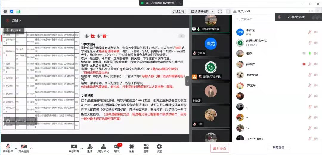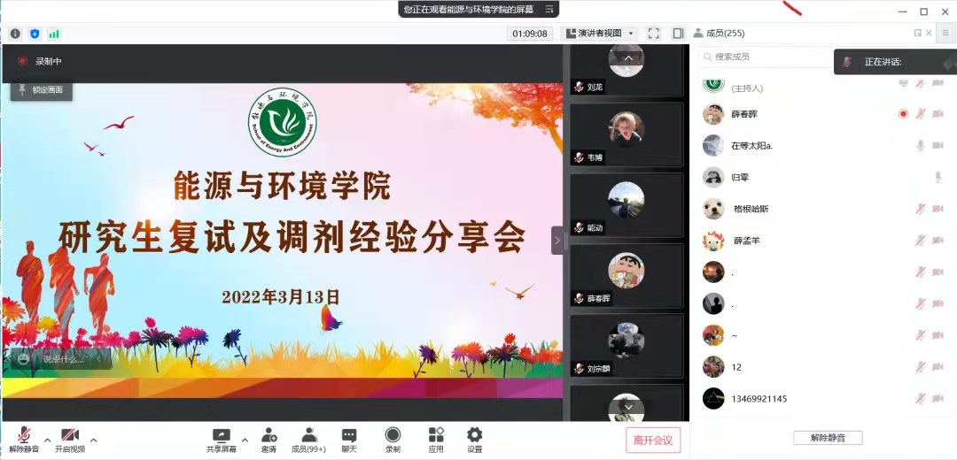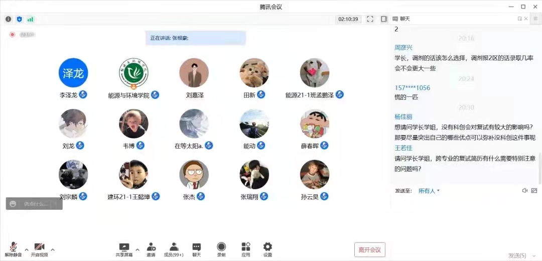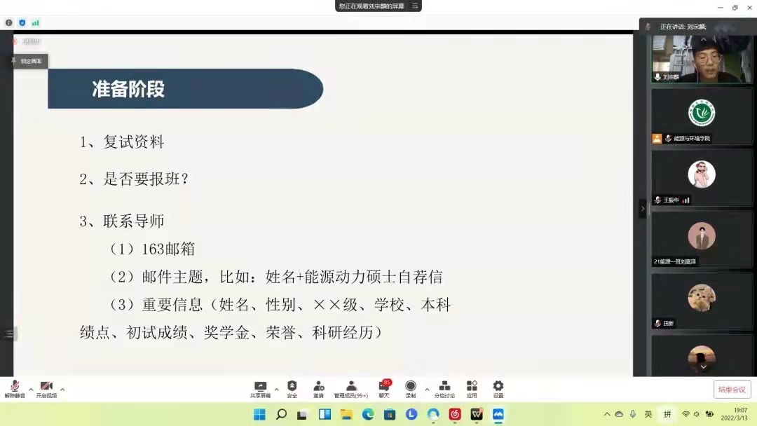 为解决我院学生关于考研复试以及调剂等方面的困惑,助力能环学子考研成功,3月13日,我院借助腾讯会议平台,以线上会议的形式顺利举行了2022届考研复试、调剂经验分享交流会。会议邀请到了学院往届考研优秀学生代表刘宗麟、宋高科、张吉洪、张艳、张根豪为我院考研学生做经验分享。五位分享嘉宾针对大家所关心的复试流程、备考经验、注意事项、调剂信息收集等多项问题进行了详细讲解,并结合个人的心路历程分享了经验。