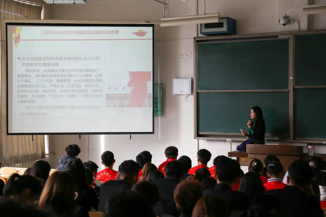 弓宇峰同志从法治是国家治理体系和治理能力的重要依托;在全面建设社会主义国家的征程上,我们要更加重视法治,厉行法治;更好发挥法治固根本、稳预期、利长远的重要作用三方面进行讲解。他表示:法律是治国理政最大最重要的规矩,法治化是实现国家现代化的必然要求,全面依法治国是中国特色社会主义的本质要求和重要保障,法治体系是国家治理体系的骨干工程。他希望同学们增强法治观念,使尊法守法成为大家的共同追求和自觉行动。