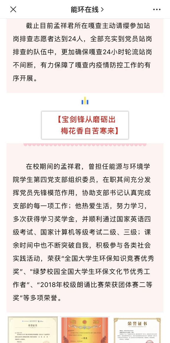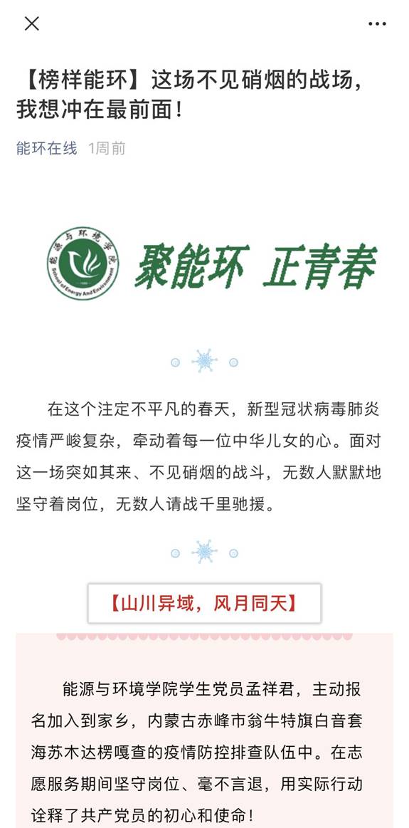 “抗击疫情,责无旁贷,身为青年,勇敢担当”。在疫情防控工作开展以来,我院共有91名青年学子,积极主动参与到防控疫情工作中,用实际行动展现着当代青年的责任和担当。来自能源16-3班学生党员孟祥君就是他们中的一员。他主动报名参加到家乡的疫情防控排查队伍中,在志愿服务期间坚守岗位、毫不言退。在他的影响下,引来了更多的站岗排查志愿者和捐款捐物的爱心人士。他用实际行动诠释了共产党员的初心和使命,用青春最美的姿态踏上抗击疫情的逆行之路。