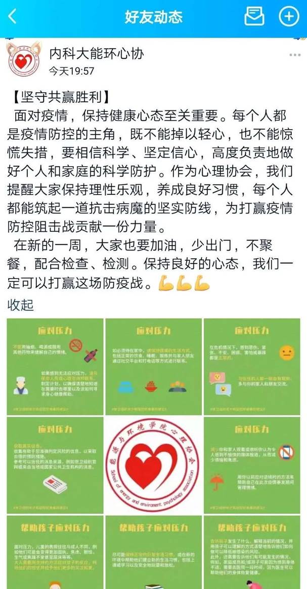 为更好地服务因新冠肺炎疫情情况导致不良情绪的同学,学院组织辅导员开展针对性的心理辅导工作,并组织学院心理健康教育协会及各班心理委员定期为班级同学推送相关的心理健康知识,使同学们能够正确理性认识新冠肺炎、消除内心的恐慌,积极向上的面对这场战“疫”。
