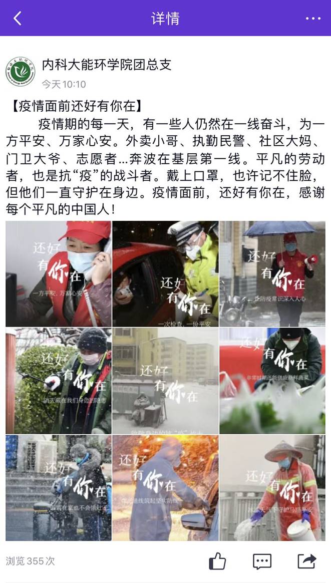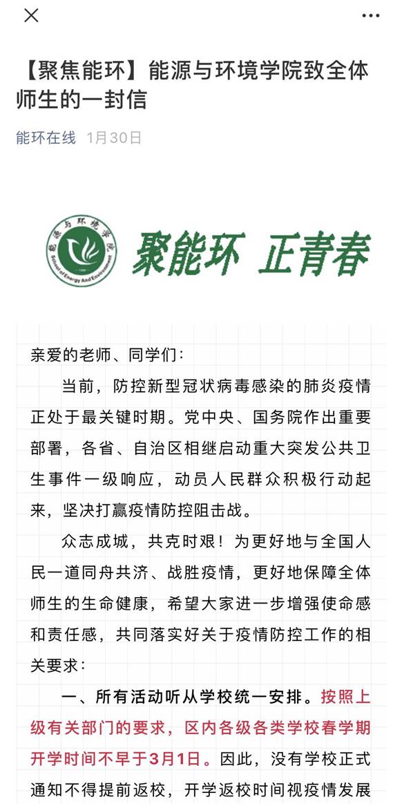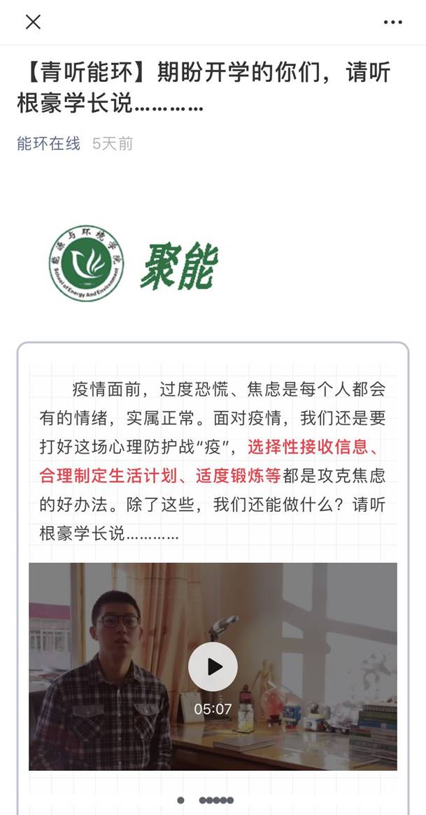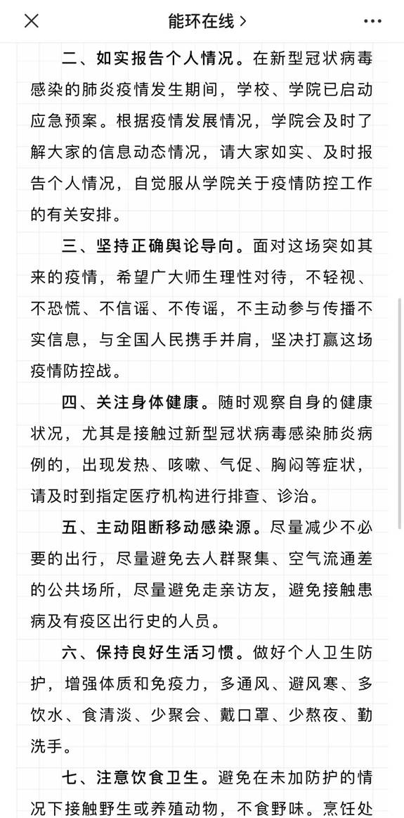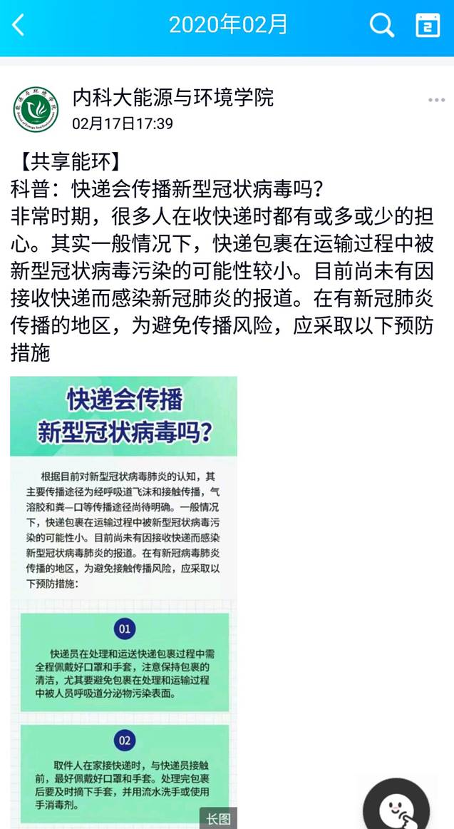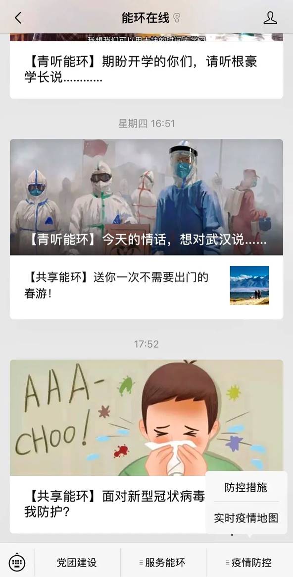 学院充分发挥新媒体信息联动、共享优势,全媒体、多平台、多渠道开展疫情防控宣传。通过学院网站、微信公众号、微博、QQ空间、抖音平台等多种方式、多种渠道积极传递正能量,密集推送宣传疫情防护知识、最新疫情消息及学校疫情防疫公告。与此同时,学院在微信公众号《能环在线》中开设 “疫情防控”专栏,发布防控公告、防控手册、防控提示,引导学院师生做好自我防护,科学理性认识疫情,不信谣、不传谣,养成文明健康生活方式。