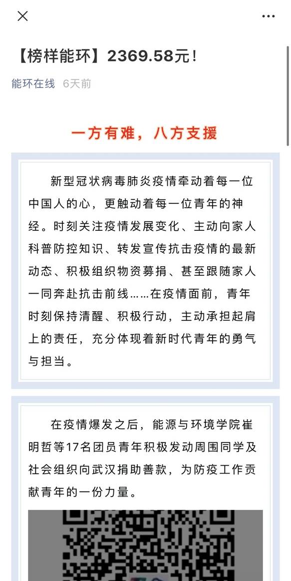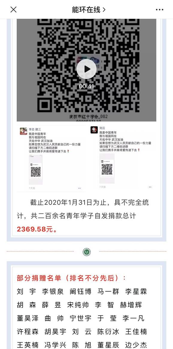 “有一份热,发一份光。” 疫情暴发之后,在yl6776永利集团建环18-3班崔明哲等人的倡议下,学院二百余名团员青年向武汉捐助了二千多元善款,为防疫工作贡献青年的一份力量。他们给自己取名叫“中国青年”。