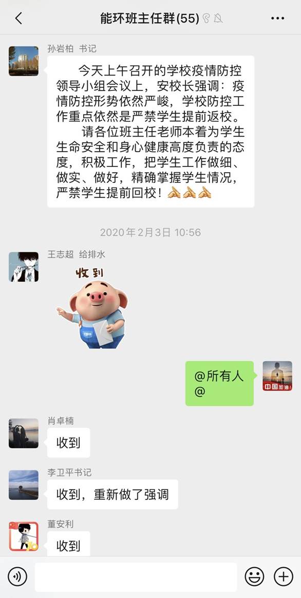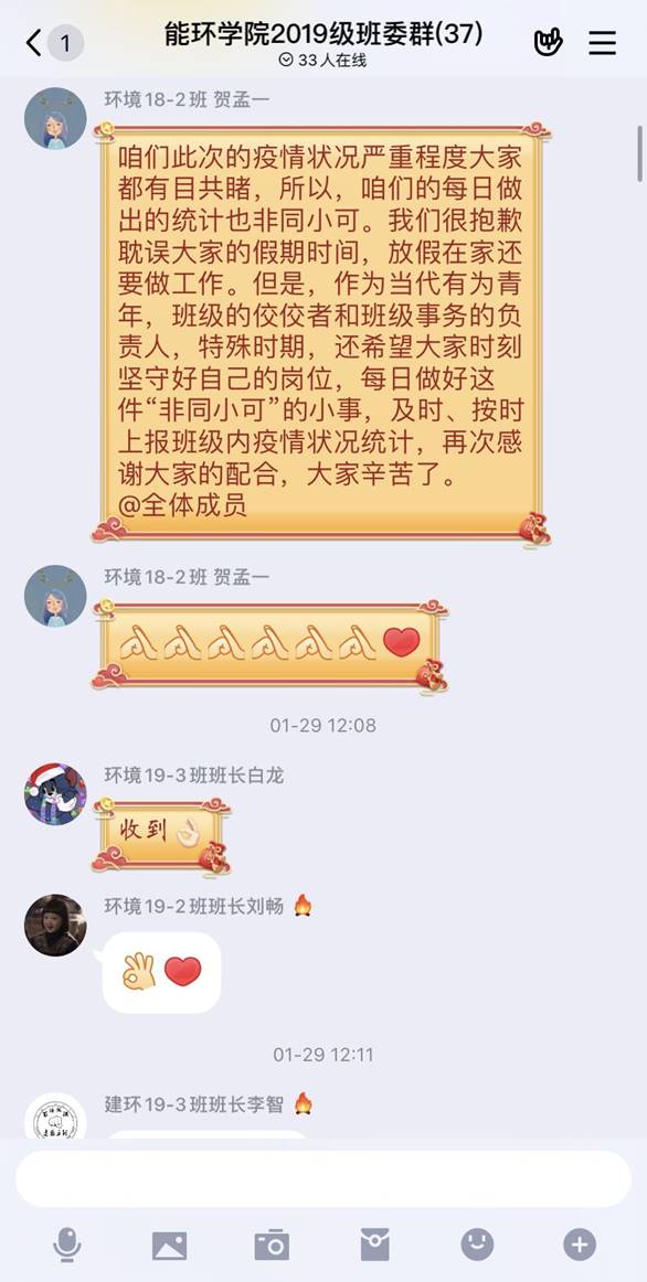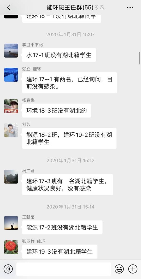 学院学生工作办公室组织全体班主任对全院学生健康情况进行摸底排查,实施每日零汇报制度,对湖北籍,特别是武汉籍学生开展一对一电话回访,登记备案,掌握假期行程和健康状况,每日汇总上报数据。
