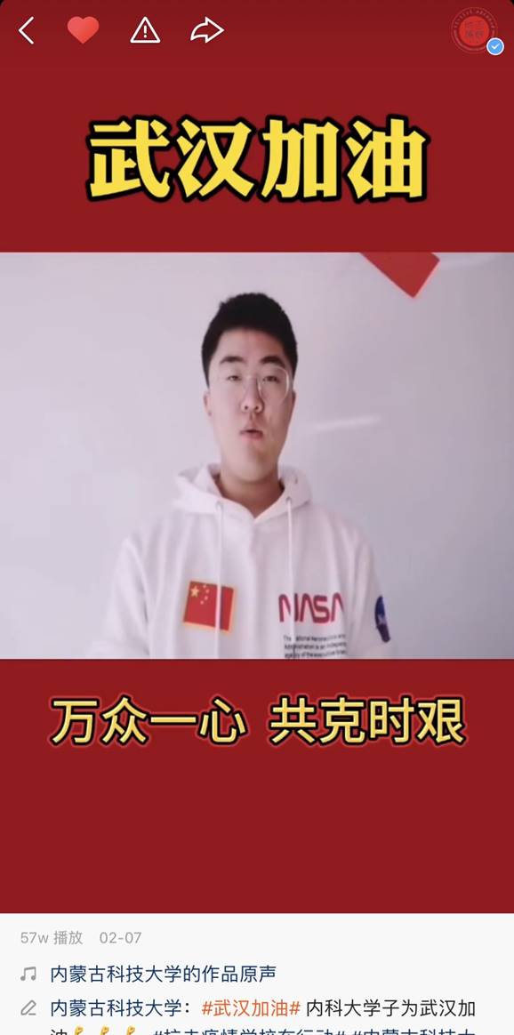 为了更好地凝聚青春力量,为抗击疫情加油鼓劲,学院倡议青年学子在家中用手语共同演绎暖心歌曲《让世界充满爱》。倡议一发出就引来诸多青年学子的热心参与,他们用手语“唱”响信念之歌,致敬战斗在抗“疫”一线的工作人员们,为武汉加油、为湖北加油、为中国加油!该视频在学校快手官方平台一经播出便受到了各界的关注和热议,播放量达57万人次,营造了传播青春正能量、众志成城共抗“疫”的浓厚氛围。