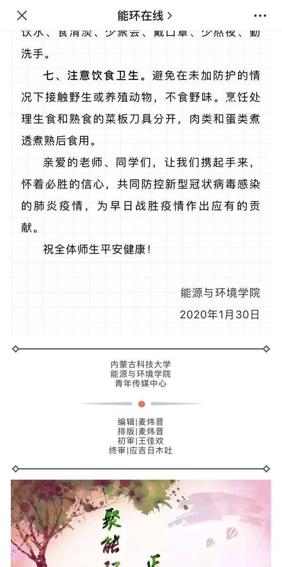 学院上下听从领导、统一行动,迅速把学校有关决策部署落到实处,及时发布《yl6776永利集团致全体师生的一封信》,号召全体师生团结一心、众志成城、共克时艰。与此同时,也要求广大师生能够关注自己的身体健康、保持良好生活习惯,做好个人卫生防护,少聚会、戴口罩、勤洗手,共同防控新冠肺炎,为早日战胜疫情作出应有的贡献。