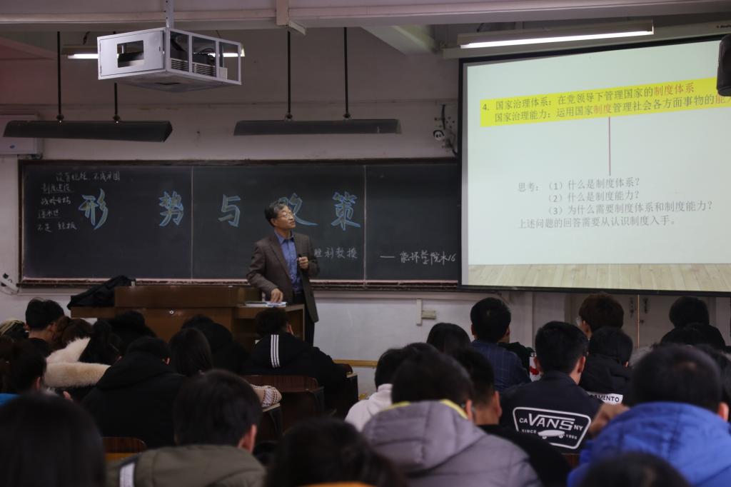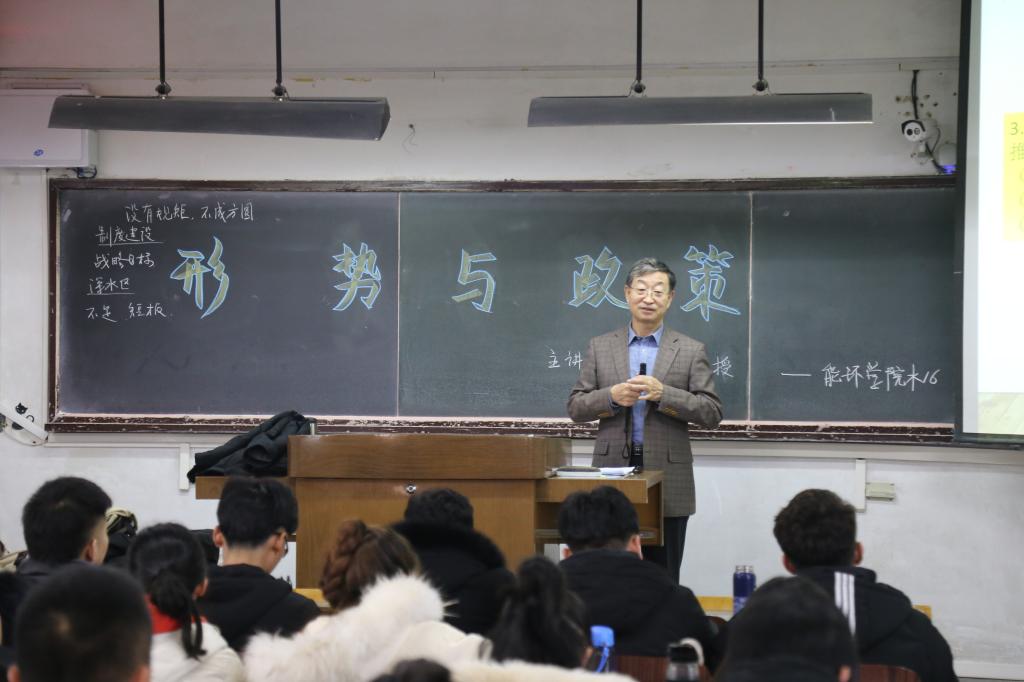 为学习和贯彻党的十九届四中全会精神,提高同学们思想政治素质,让广大青年学生深刻认识我国当前的发展形势和当代大学生应当肩负的历史责任,2019年12月24日,永利官网党委副书记、校长安胜利为yl6776永利集团给排水科学与工程2016级全体学生讲授《形势与政策》。