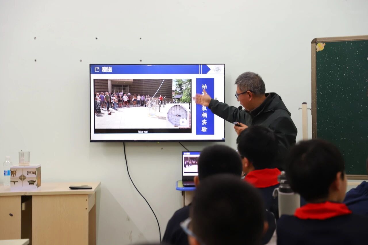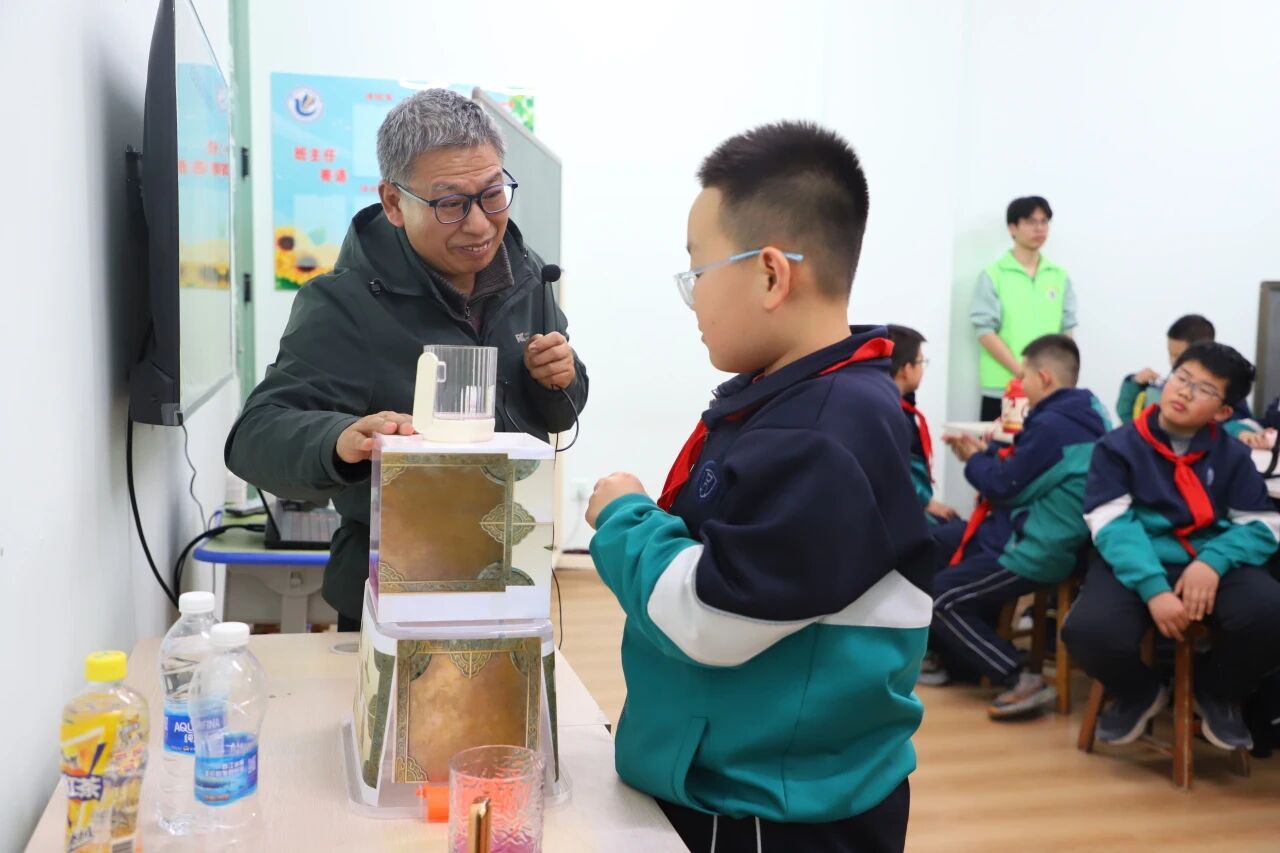 3月18日,第一节课由郑坤灿教授主讲,郑教授以传统器物“公道杯”为切入点,通过“讲解+实验”的形式直观呈现“满则溢、半则存”的物理现象。讲解中郑教授讲授流体力学在“公道杯”中的应用,并延伸至现代工程实例,同时将物理原理与中华优秀传统文化中的“满招损,谦受益”有机融合,让小学生们体验了一堂别开生面的“大学生物理课”。