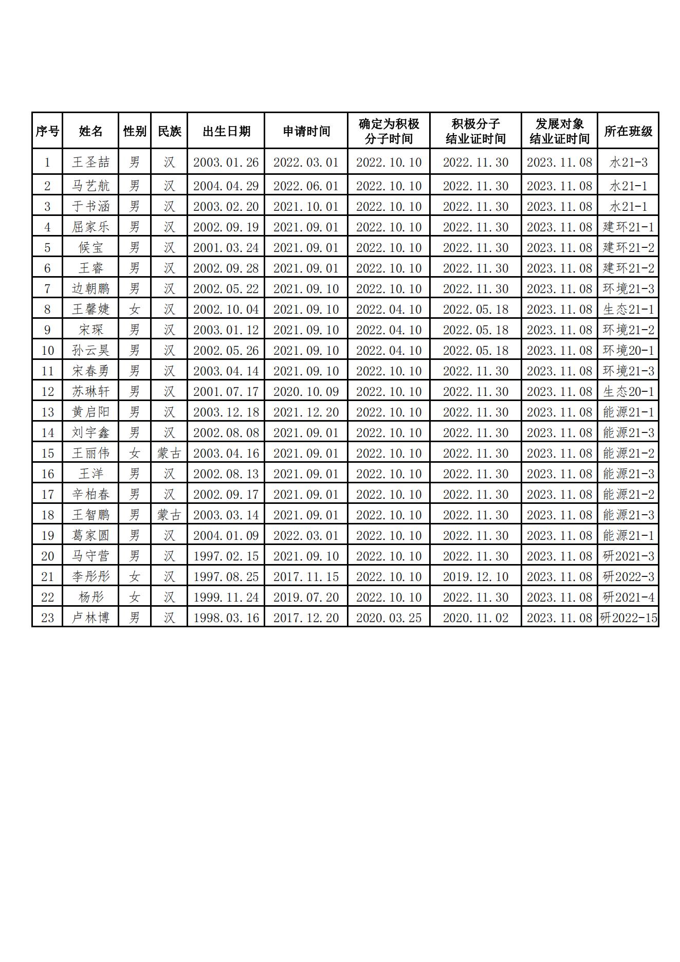 经过一年以上的培养教育和考察,王圣喆、马艺航、于书涵、屈家乐、候宝、王睿、边朝鹏、王馨婕、宋琛、孙云昊、宋春勇、苏琳轩、黄启阳、刘宇鑫、王丽伟、王洋、辛柏春、王智鹏、葛家圆、马守营、李彤彤、杨彤和卢林博共二十三位同志拟接收为中共预备党员(详见附表)。为进一步增强发展党员工作的透明度,确保发展新党员的质量,根据《中国共产党章程》和《中国共产党发展党员工作细则》,现将发展对象的基本情况予以公示。