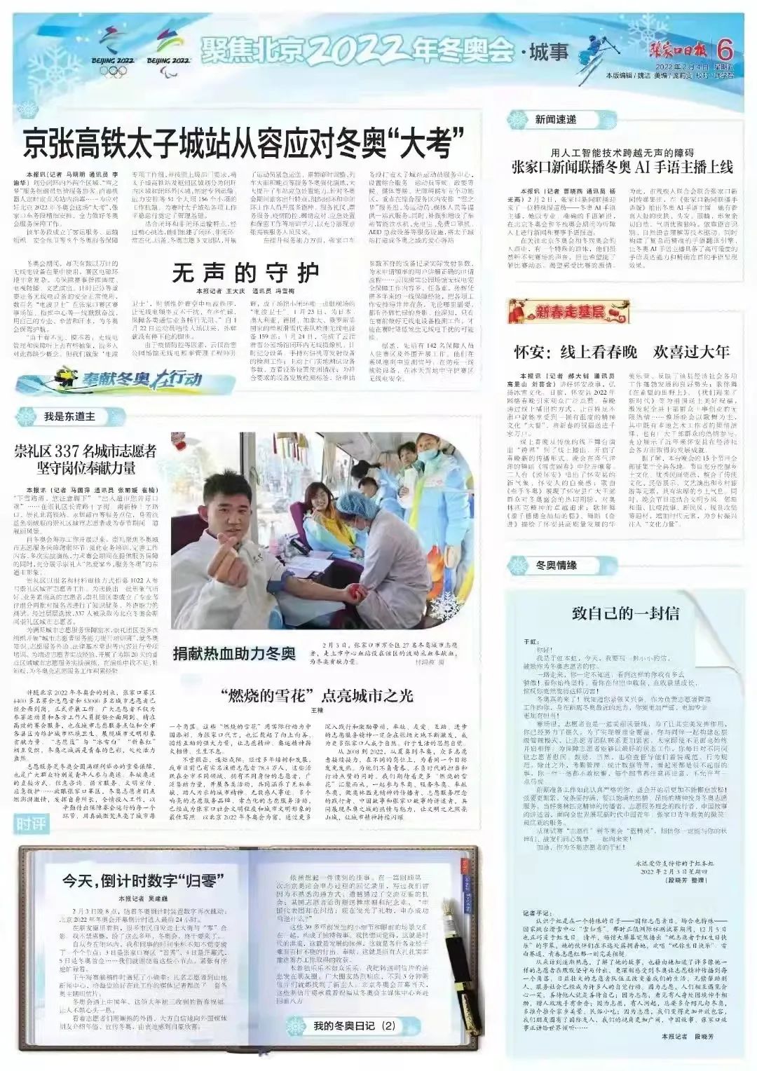 提到志愿服务工作内容时,惠文杰兴奋的说:“我们需要干的活儿非常多。担任讲解员,为前来观看冬奥会的各地友人讲解塞外名城张家口;参与公益献血,为张家口赛区的血液保障贡献青春热血。大雪来临之时,我们更是全副武装,冲向各个点位清扫道路,保障赛事安全。雪一直下,我们便一直扫。当然,在休息时间,我们还会集体捏我们的冰墩墩,雪容融。”