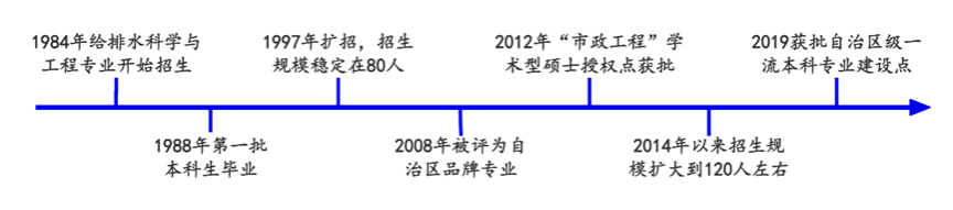 给排水科学与工程专业隶属于yl6776永利集团,专业始建于1984年,同年开始招收本科生,初始招生规模约40人/年,并于1988年培养出第一届毕业生。1997年起,专业招生规模扩大至80人/年左右并保持稳定。2008年,专业获评内蒙古自治区品牌专业;2014年招生规模再次调整至120人/年;2019年获批自治区级一流本科专业建设点,标志着专业建设水平持续提升。2012年,“市政工程”学术型硕士点的获批使专业实现了本硕贯通培养,形成了完整的高等教育人才培养体系。